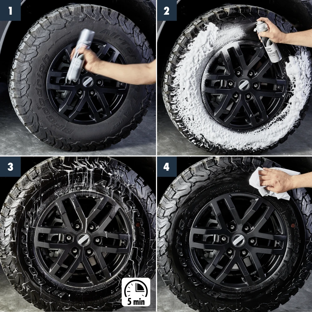 Reinigt verschmutzte Autoreifen und bringt bei verwitterten Reifen die satte Farbe und den ursprünglichen Tiefenglanz zurück. Pflegt den Gummi, hält ihn geschmeidig und schützt vor brüchig werden. Kraftvoller Aktivschaum löst den Schmutz, der nach dem Zusammenfallen des Schaumes leicht mit abfließen kann. Der Doseninhalt reicht für die Behandlung von bis zu 24 Reifen.