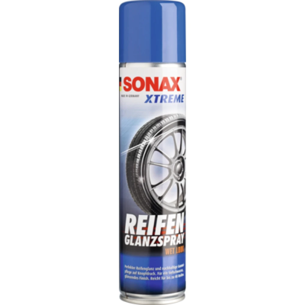 SONAX XTREME ReifenGlanzSpray Wet Look für langanhaltenden satten Tiefenglanz. Der Gummi wird gleichzeitig gepflegt und bei regelmäßiger Anwendung vor Rissbildung, vorzeitiger Alterung und Farbausbleichung geschützt. Die tiefschwarze glänzende Optik hält mehrere Wochen. Für alle Reifentypen geeignet. Extrem einfache Anwendung: dünn aufsprühen, einwirken lassen, fertig. Reicht für bis zu 40 Reifen.