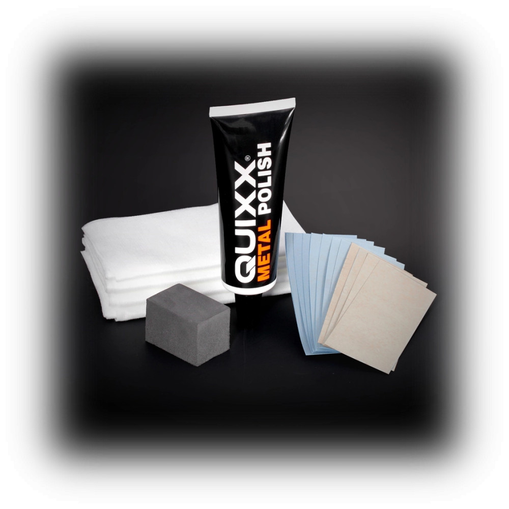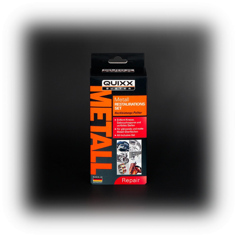 Das QUIXX Metall Restaurations Set ist das ultimative Produkt, um verschmutzte oder oxidierte Metalloberflächen wieder schön zu bekommen. Es eignet sich für glänzende und matte Oberflächen von Metallen wie Gold, Silber, Platin, Chrom, Edelstahl, Aluminium, Magnesium, Messing, Kupfer und Nickel. Das Hochleistungs-Politurkonzentrat reinigt und poliert nicht nur die Oberfläche, es hinterlässt auch eine leistungsstarke Schutzschicht.