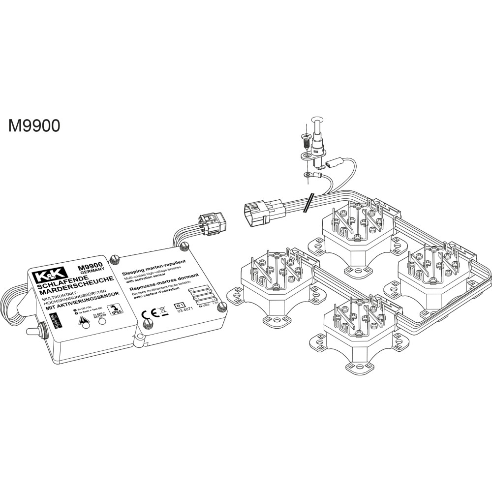 Hochspannungsabwehr ist gerade bei besonders aggressiven Tieren im Revierkampf und „Veteranen“ mit veränderter Hörschwelle unumgänglich. Als besonders effektiv haben sich hierbei die felldurchdringenden K&K +/- Hochspannungsbürsten bewährt, weshalb sie auch beim M9900 in 4-facher Ausführung zum Einsatz kommen. Im Gegensatz zu herkömmlichen Kontaktplatten kämmen die Edelstahlbürsten durch das Fell und so bieten nicht nur Pfote und Schnauze eine Angriffsfläche, sondern der gesamte Körper des Eindringlings. Aufgrund der wasserdicht vergossenen Elektronik, kann das Gerät besonders tief im Motorraum angebracht werden und agiert somit als „Türsteher“ für den besonders schutzwürdigen Eintrittsbereich des Marders. Die flexibel verschiebsowie erweiterbaren Edelstahlbürsten ermöglichen zudem eine optimale Anpassung an den jeweiligen Motorraum. Wird die Motorhaube geöffnet führt der Sicherheits-Motorhaubenschalter zu einem sofortigen Abbau der Hochspannung an den Kontaktplatten und ermöglicht somit ein gefahrloses Arbeiten. Selbstverständlich erfüllt auch diese Innovation die strengen OEM Anforderungen.
