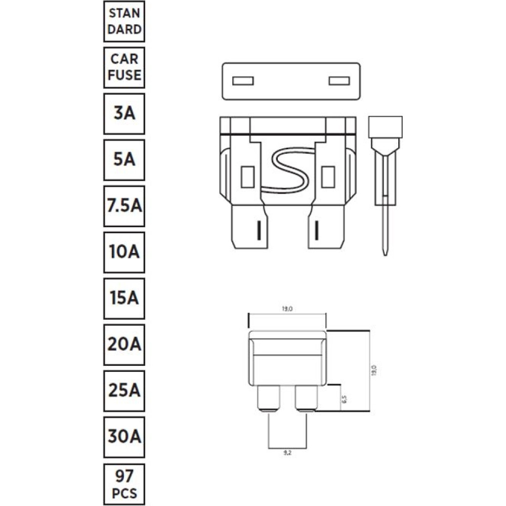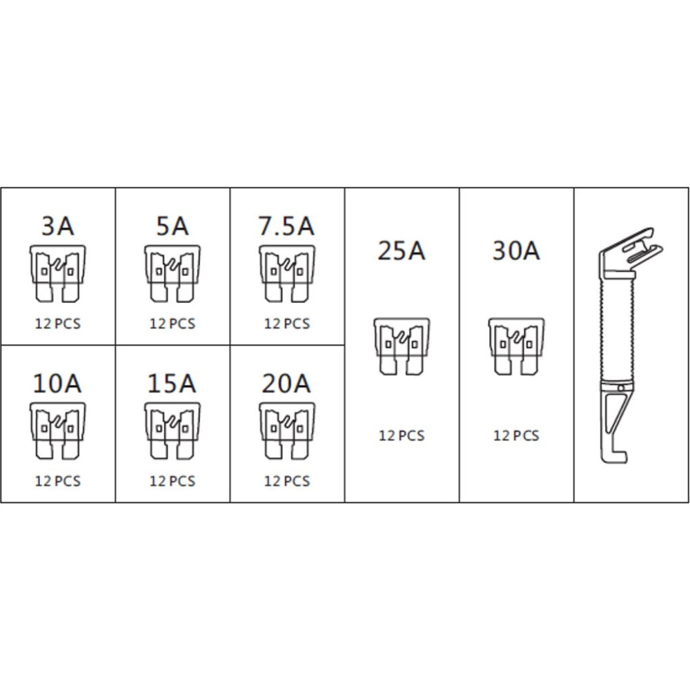 03.1005 Satzsicherung Standard (Ato), 97 Stück: 3A, 5A, 7,5A, 10A, 15A, 20A, 25A, 30A