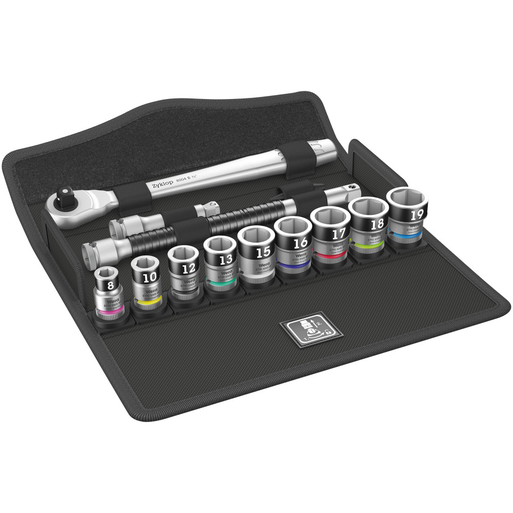 1x 8100 SB HF 1 Zyklop Metal-Knarrensatz, Umschalthebel, mit Haltefunktion, 3/8?-Antrieb, metrisch, 13-teilig; 1x 8004 B Zyklop Metal-Knarre mit Umschalthebel mit 3/8?-Antrieb, 3/8? x 222 mm; 9x 8790 HMB HF Zyklop-Steckschlüsseleinsatz mit 3/8?-Antrieb mit Haltefunktion: 8.0x29.0, 10.0x29.0, 12.0x29.0, 13.0x29.0, 15.0x29.0, 16.0x29.0, 17.0x29.0, 18.0x29.0, 19.0x29.0; 1x 8794 LB Zyklop-Verlängerung mit Schnelldrehhülse, lang, 3/8?, 3/8? x 200 mm; 1x 8794 B Zyklop-?Wobble?-Verlängerung, 3/8?, 3/8? x 76 mm; 1x Mutterentnahme-Werkzeug, 43 x 14 mm; 1x Klettstreifen 240, 240 x 50 mm