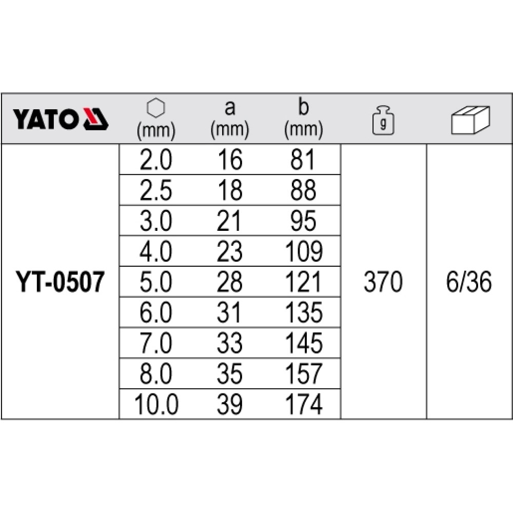 YT-0507 Sechskant-Stiftschlüsselsatz Kugel 9Tlg. 2û10 mm Cr-V