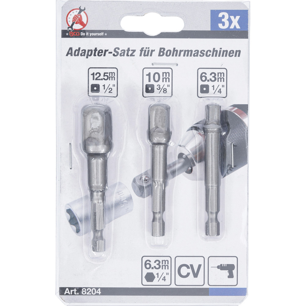 BGS Adapter-Satz für Bohrmaschinen Antrieb Außensechskant 6,3 mm (1/4 ) Abtrieb Außenvierkant 6,3 mm (1/4 ) / 10 mm (3/8 ) / 12,5 mm (1/2 ) 3-tlg BGS Do it yourself 8204