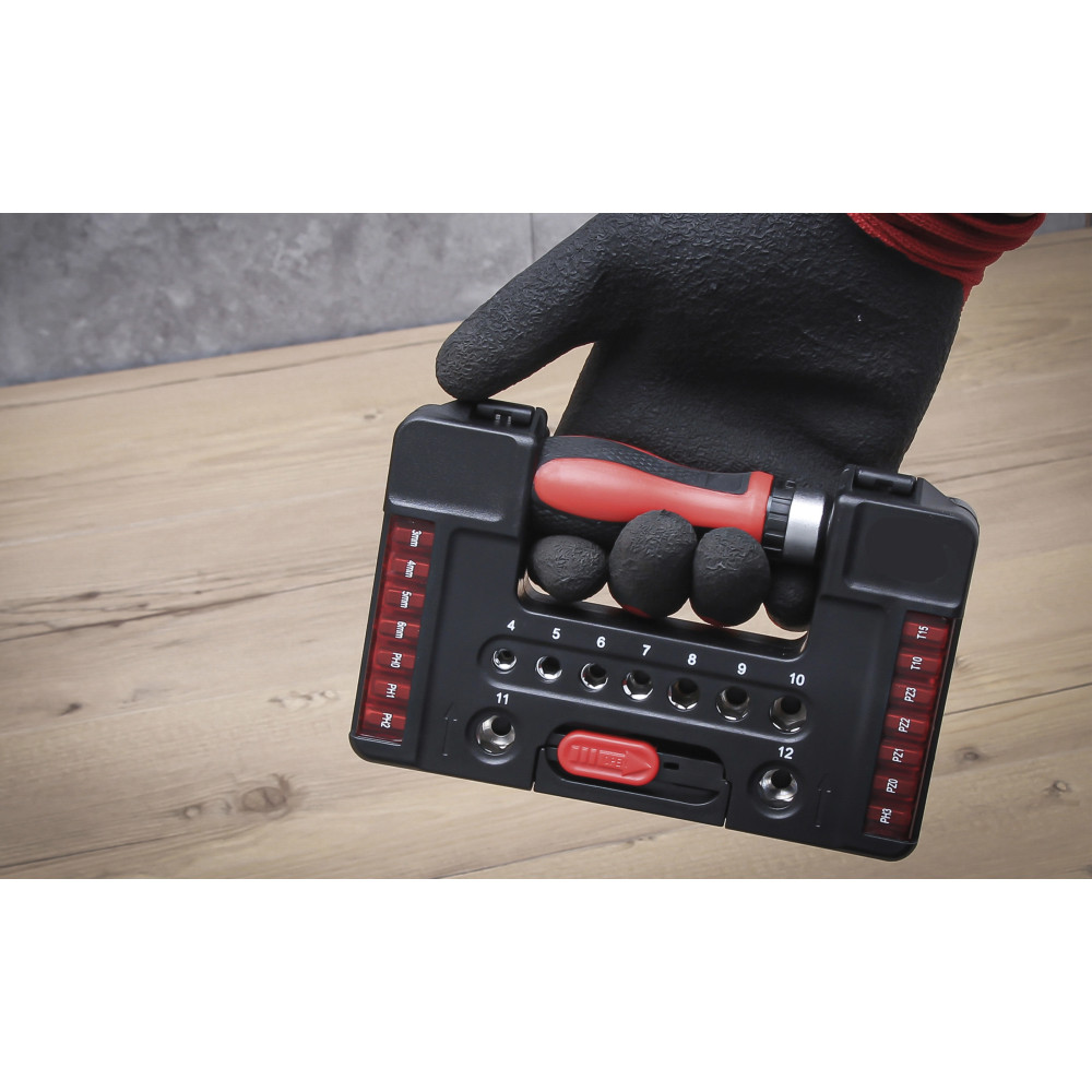 - 4 Bits, Antrieb Außensechskant 6,3 mm (1/4"), Schlitz: 3 - 4 - 5 - 6 mm