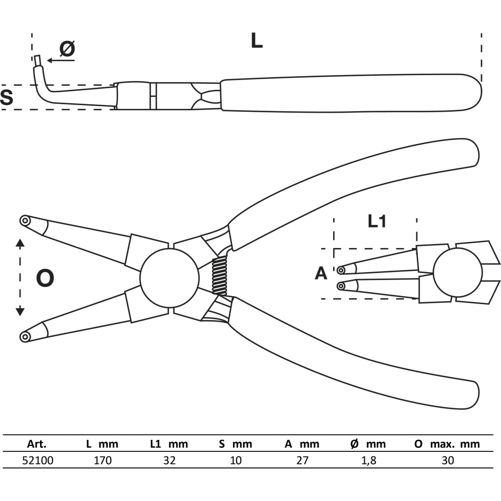 - 1 Zange für Außensicherungsringe, abgewinkelt, 175 mm, Öffnungsmaß max. 33 mm
