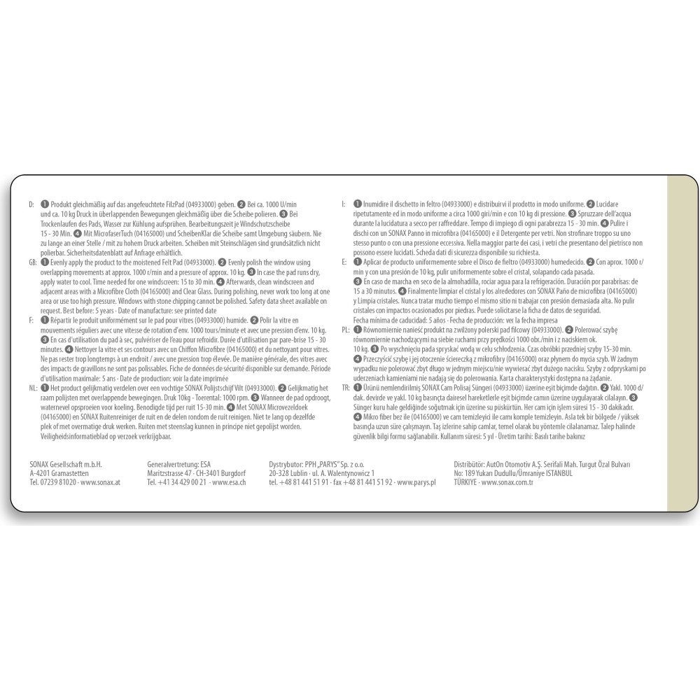 Glaspolitur zum Entfernen von leichten Verkratzungen, Vermattungen und Verätzungen auf Kfz-Windschutzscheiben und Seitenscheiben aus Echtglas. Auch zur Entfernung von störenden und defekten Scheibenversiegelungen geeignet. Chemisch-mechanisches Polieren mit Ceroxid.