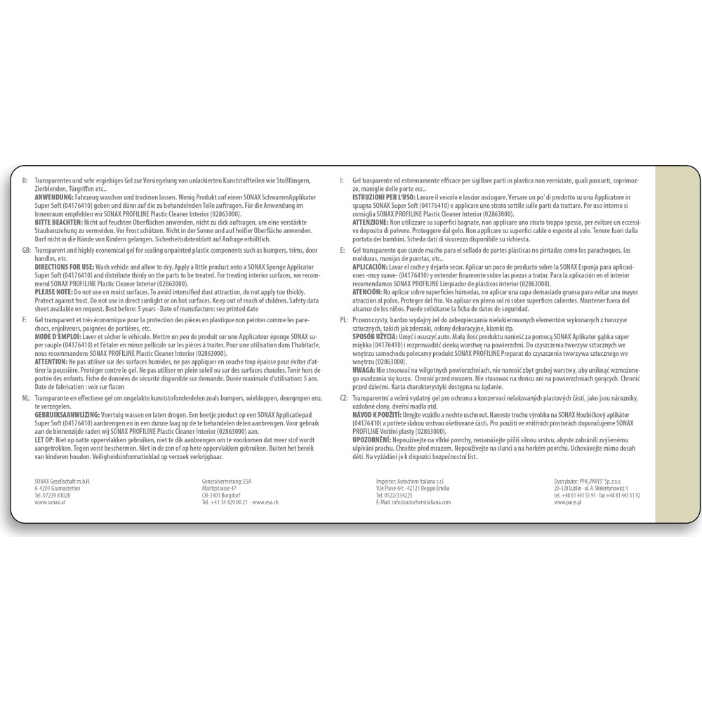 Hochwirksame, silikonfreie Kunststofftiefenpflege für unlackierte Kunststoffteile an der Fahrzeugaußenseite. Gibt verwitterten Stoßfängern oder Zierblenden ihre ursprüngliche Farbtiefe zurück und sorgt für einen neuwertigen Glanzeffekt. Die vorher porösen Oberflächen werden versiegelt und es entsteht ein hervorragender, langanhaltender Schutz vor Umwelteinflüssen, welcher mehrere Shampoowäschen überdauert.