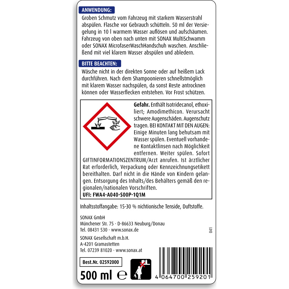 - Fahrzeug von oben nach unten mit SONAX MultiSchwammoder SONAX MicrofaserWaschHandschuh waschen.